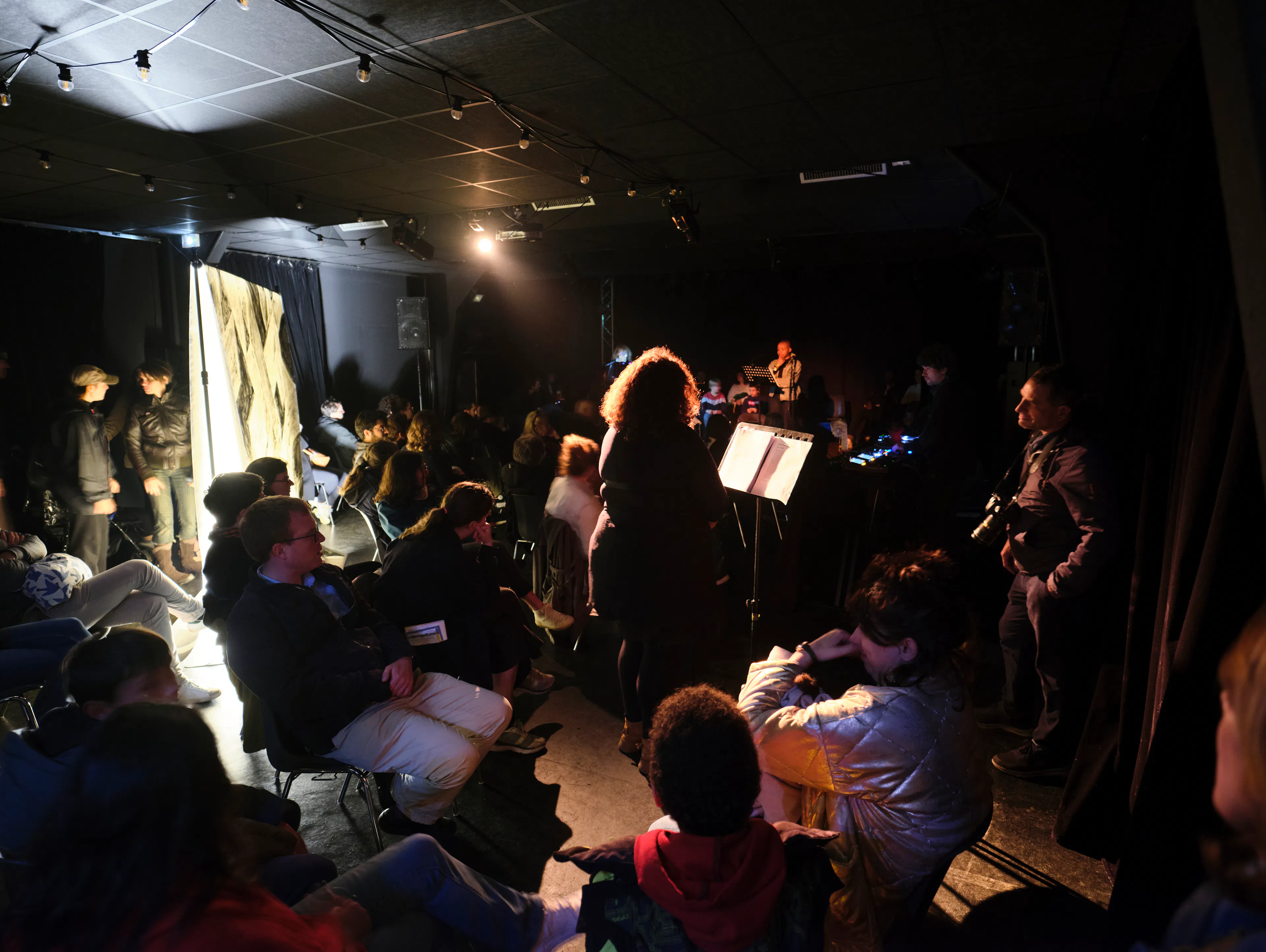 Chair de poule, évènement Nuit Blanche organisé dans le cadre du cycle KUTSCH, Maison populaire, avec Clarisse Aïn, Camila Farina,Georges DJ Huberman, Philippe Baudouin, Caroline Carré, Nora de Paz et Viviane Bossina, © G-R-G